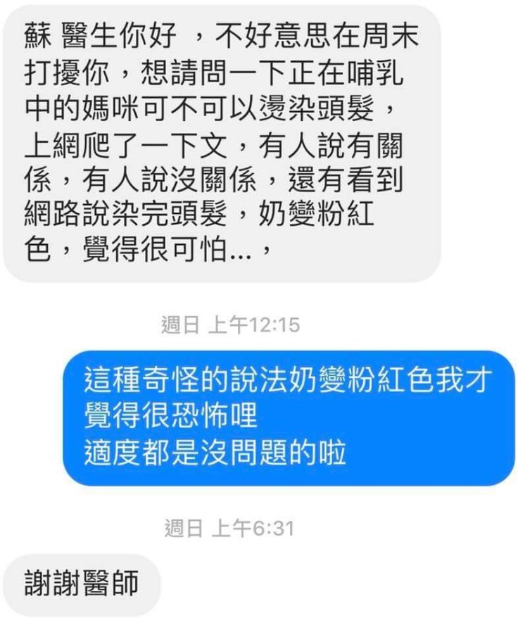 蘇醫生你好 ,不好意思在周末打擾你,想請問一下正在哺乳中的媽咪可不可以燙染頭髮, 上網爬了一下文,有人說有關係,有人說沒關係,還有看到網路說染完頭髮,奶變粉紅色,覺得很可怕…,