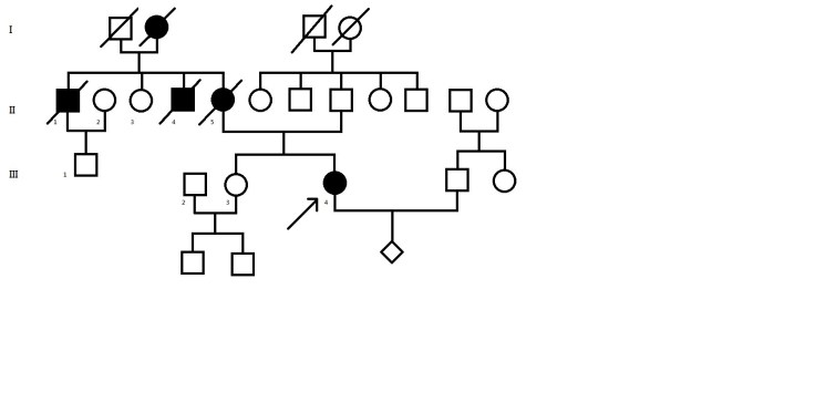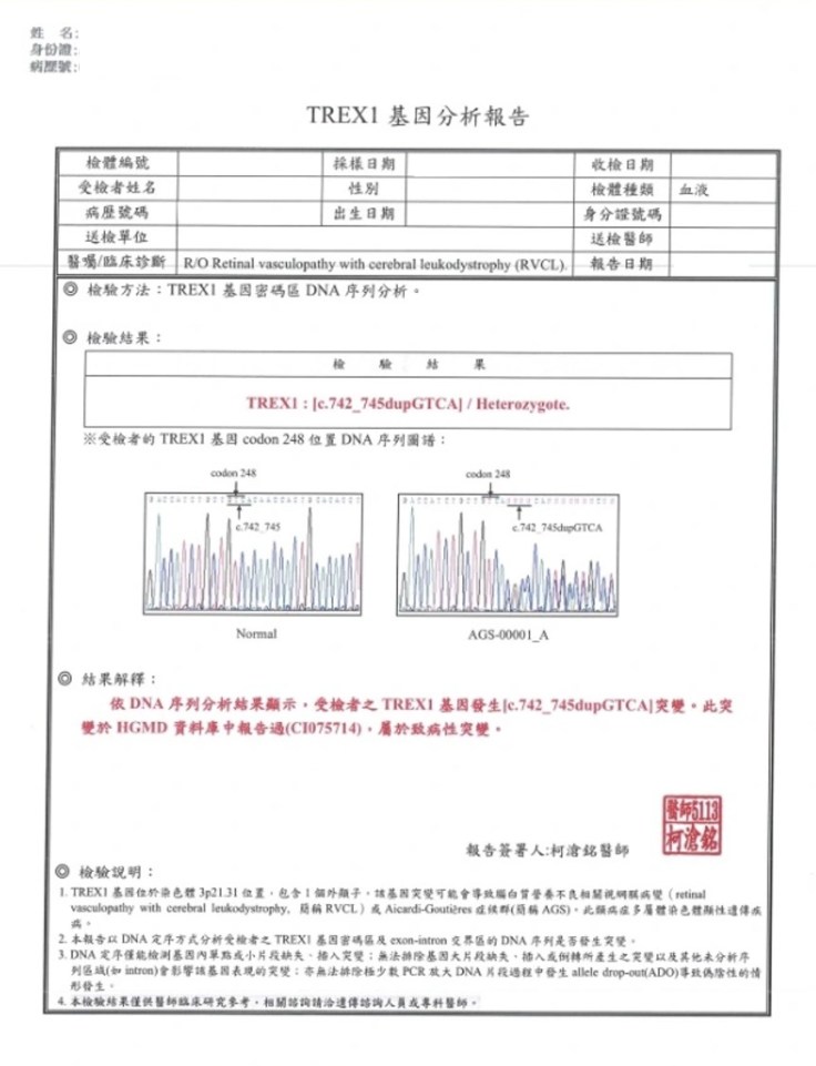 小穎的家族有遺傳疾病,已有四人發病,A君成年後走路開始跛行,進行核磁共振掃描發現疑似腦瘤,但切片結果為良性,於30歲左右過世。B君成年之後突然出現手指無力症狀,於醫學中心以類固醇治療,之後在另家醫學中心追蹤核磁共振掃描亦發現疑似腦瘤,40歲過世。C君(小穎母親)年輕時一隻眼睛出現黑點,30歲左右去美國姐姐家探親時,身體左半邊突然有類似中風症狀、手麻,之後返台於北榮宋秉文醫師門診追蹤,診斷為:Aicardi-Goutières Syndrome(AGS), 48歲時死於多重器官衰竭。小穎本人28歲時右眼出現視力缺損,疑似眼睛中風,之後也在○○醫院門診追蹤;除此之外,尿液有蛋白尿,目前腎功能正常,腦部尚未出現異常病兆,至台大基因醫學部諮詢,疑似視網膜血管病變合併腦白質失養症,外送檢體進行基因診斷並確診罹病,目前仍於○○醫院追蹤,使用葉酸與眼藥水治療。