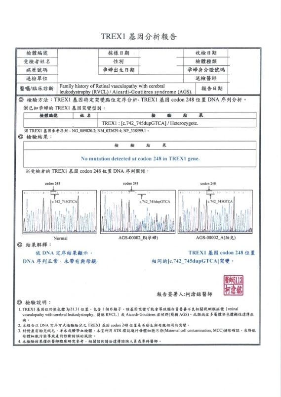 小穎在家驗孕呈陽性,故針對家族遺傳疾病前來諮詢可進行的相關檢測,建議小穎可以在懷孕10週時執行CVS(絨毛採樣)進行TREX1基因確診。小穎除將在外院所作的檢測報告諮詢外,回歸正常產檢。
