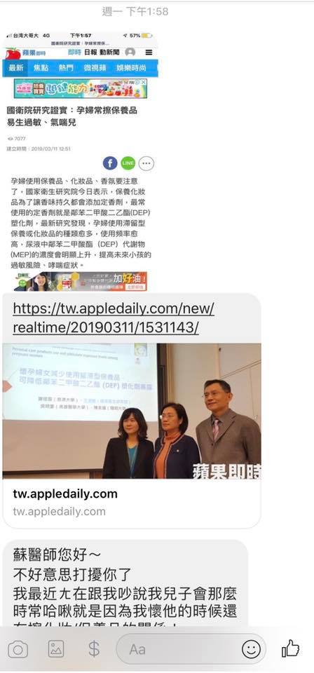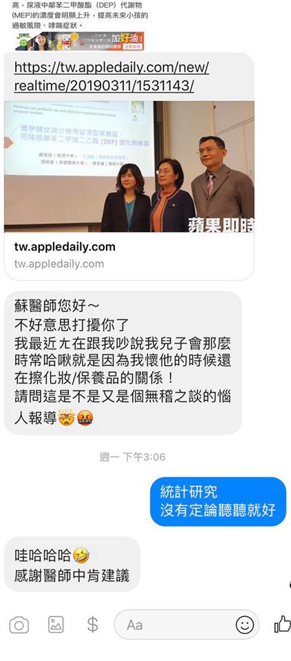 這就是國衛院的一個科學研究利用採檢孕婦三個孕期各一次的尿液分析鄰苯二甲酸酯代謝物的量加上第三孕期時作一次問卷詢問孕婦11類保養品的大略使用頻率結果發現某些停留在皮膚上的保養品種類孕婦使用越頻繁尿中的鄰苯二甲酸酯代謝物的量越高