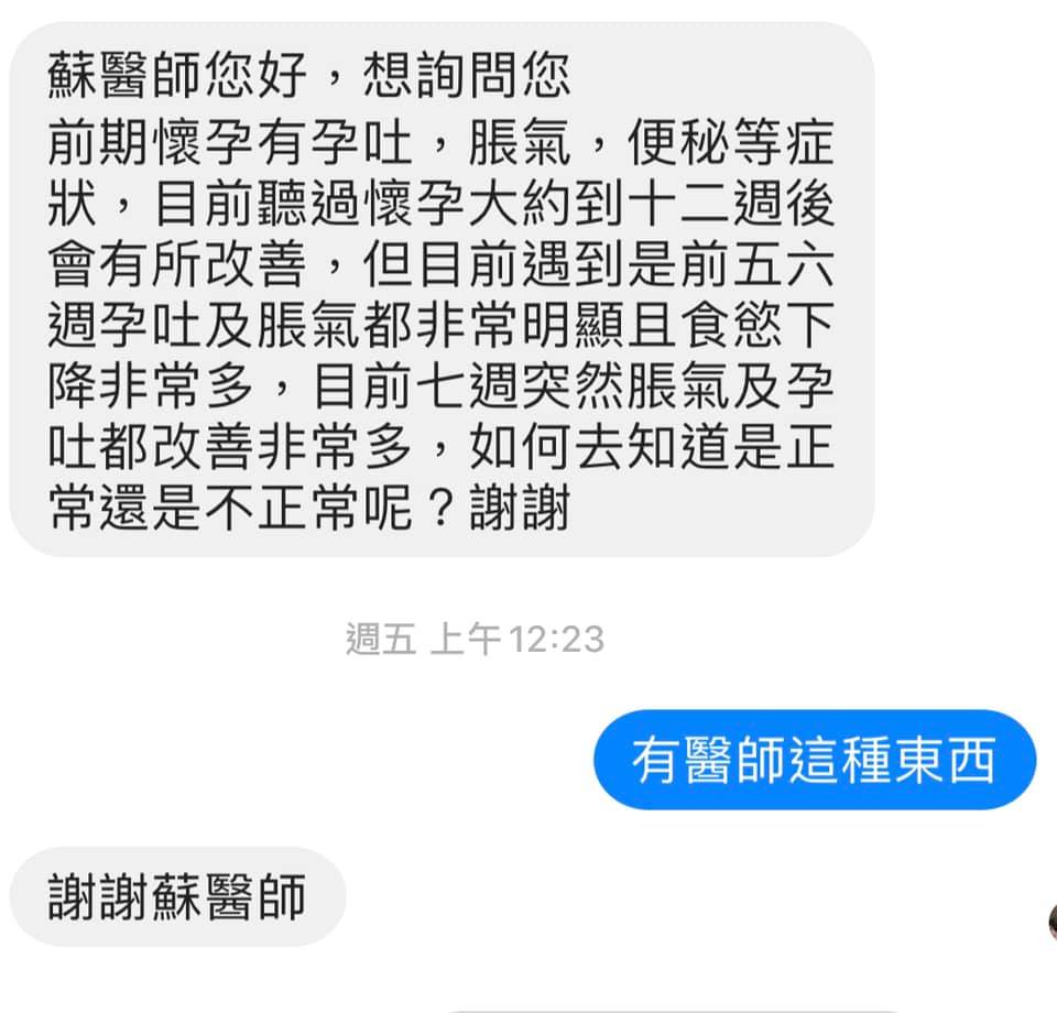 蘇醫師您好,想詢問您前期懷孕有孕吐,脹氣,便秘等症狀,目前聽過懷孕大約到十二週後會有所改善,但目前遇到是前五六週孕吐及脹氣都非常明顯且食慾下降非常多,目前七週突然脹氣及孕吐都改善非常多,如何去知道是正常還是不正常呢?謝謝