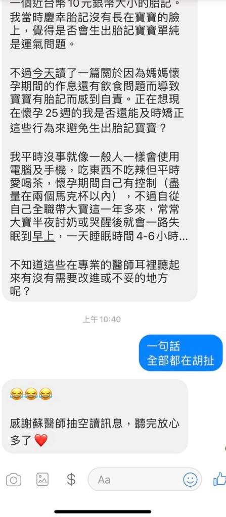 蘇醫師您好,很抱歉私訓打擾您。如果您有空再麻煩您回覆就好。沒有空也沒有關係的。想請教您一個問題:關於如何避免生出有胎記的寶寶。我目前懷孕近25週,是高齡40歲的孕婦。今天剛好讀到一篇關於胎記寶寶的文章,說明會生出胎記寶寶,主要是因為媽媽在懷孕期間,飲食、作息、以及長期使用電腦及手機的後果。想請教醫師,這些是否正確呢?不知您是否已經有分享過類似文章可以分享給我?或是近期內可以分享類似文章?我有個2歲多的大寶,兩手上都各有一個近台幣10元銀幣大小的胎記。我當時慶幸胎記沒有長在寶寶的臉上,覺得是否會生出胎記寶寶單純是運氣問題。不過今天讀了一篇關於因為媽媽懷孕期間的作息還有飲食問題而導致寶寶有胎記而感到自責。正在想現在懷孕25週的我是否還能及時矯正這些行為來避免生出胎記寶寶?我平時沒事就像一般人一樣會使用電腦及手機,吃東西不吃辣但平時愛喝茶,懷孕期間自己有控制(盡量在兩個馬克杯以內),不過自從自己全職帶大寶這一年多來,常常大寶半夜討奶或哭醒後就會一路失眠到早上,一天睡眠時間4-6小時…不知道這些在專業的醫師耳裡聽起來有沒有需要改進或不妥的地方呢?