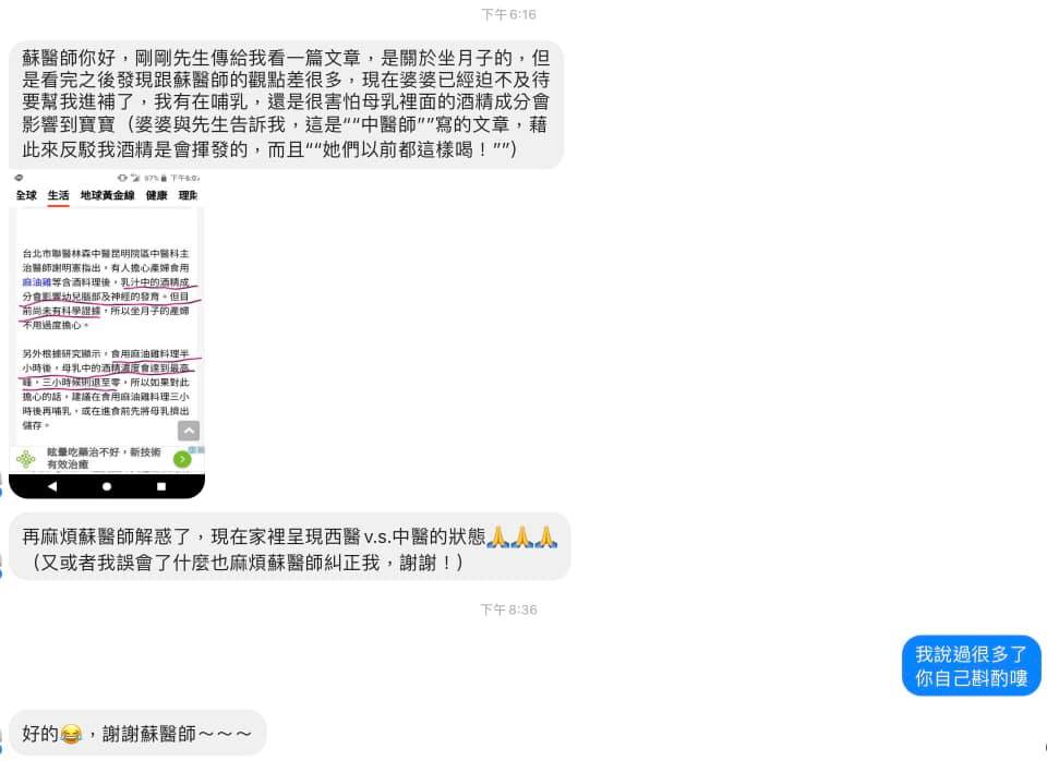 蘇醫師你好,剛剛先生傳給我看一篇文章,是關於坐月子的,但是看完之後發現跟蘇醫師的觀點差很多,現在婆婆已經迫不及待要幫我進補了,我有在哺乳,還是很害怕母乳裡面的酒精成分會影響到寶寶(婆婆與先生告訴我,這是““中醫師””寫的文章,藉此來反駁我酒精是會揮發的,而且““她們以前都這樣喝!””)再麻煩蘇醫師解惑了,現在家裡呈現西醫v.s.中醫的狀態![]()