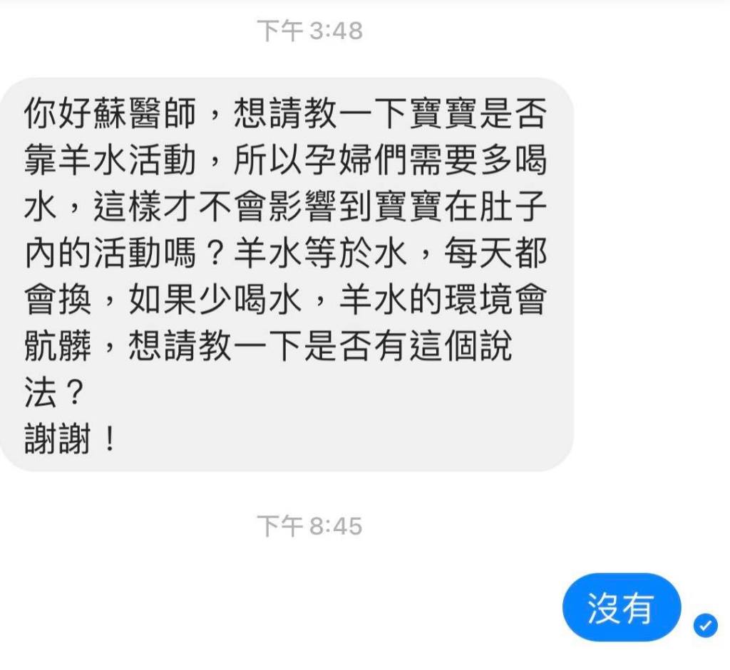 你好蘇醫師,想請教一下寶寶是否靠羊水活動,所以孕婦們需要多喝水,這樣才不會影響到寶寶在肚子內的活動嗎?羊水等於水,每天都會換,如果少喝水,羊水的環境會骯髒,想請教一下是否有這個說法?謝謝!