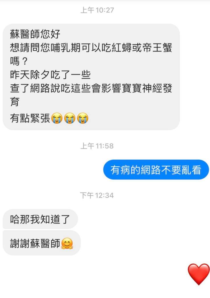 HI 蘇醫生,我希望你能常常宣導發那些文章,我本身也是個孕婦,我今天在社群看到一個比我還菜鳥的新手媽媽,再問說"孕期為什麼不能醋",其實我當初孕吐很嚴重,醫生說如果你本身不排斥水果醋可以喝些讓自己孕吐好過一點,於是我就這樣地分享,沒想到還有媽媽說"喝了胎兒會畸形,還回覆我說整個孕期都不能吃酸,說有相關數據"(我坐等相關數據)