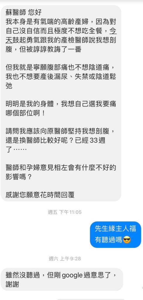 今天鼓起勇氣跟我的產檢醫師說我想剖腹,但被諄諄教誨了一番
