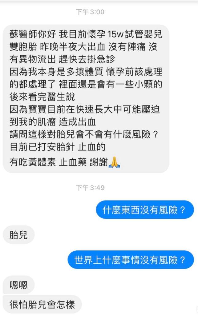 我目前懷孕15w試管嬰兒雙胞胎 昨晚半夜大出血 沒有陣痛 沒有異物流出 趕快去掛急診