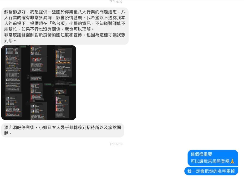 蘇醫師您好,我想提供一些關於停業後八大行業的問題給您,八大行業的確有非常多漏洞,影響疫情甚廣,我希望以不透露我本人的前提下,提供現在「私台版」坐檯的資訊,不知道醫師能不能幫忙,如果不行也沒有關係,我也可以理解。