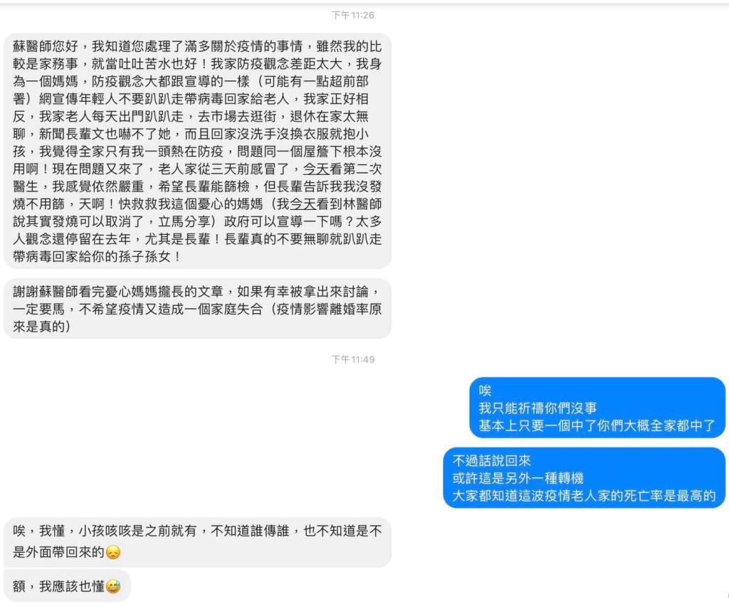 蘇醫師您好,我知道您處理了滿多關於疫情的事情,雖然我的比較是家務事,就當吐吐苦水也好!