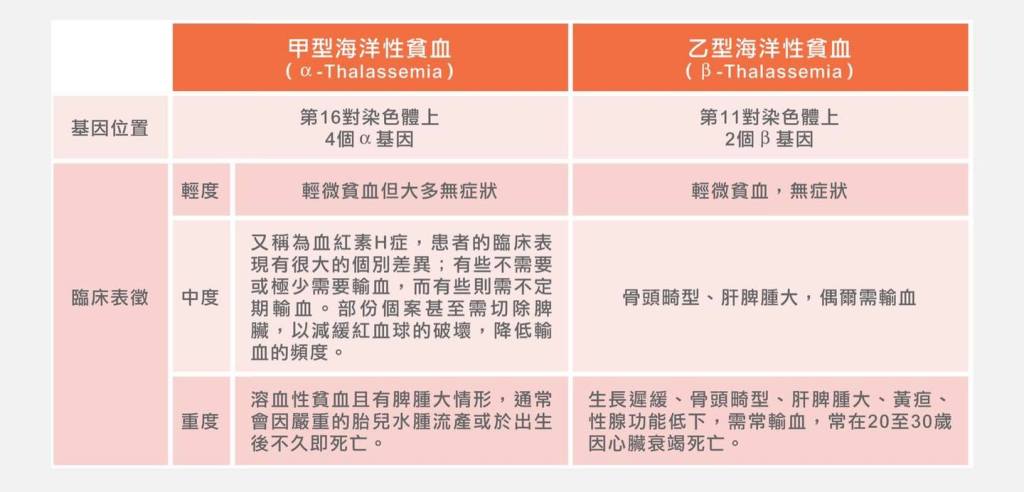 海洋性貧血依異常基因的位置不同,有甲型海洋性貧血(α-Thalassemia)和乙型海洋性貧血(β-Thalassemia)。兩種海洋性貧血為獨立遺傳,很少因突變而發生,如果寶寶是重度的患者,則其父母有很大的機率皆為帶因者。