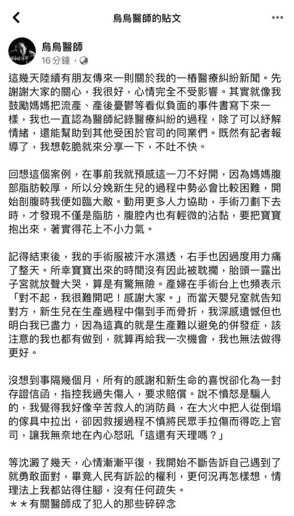 記得結束後,我的手術服被汗水濕透,右手也因過度用力痛了整天。所幸寶寶出來的時間沒有因此被耽擱,胎頭一露出子宮就放聲大哭,算是有驚無險。產婦在手術台上也頻表示「對不起,我很難開吧!感謝大家。」而當天嬰兒室就告知對方,新生兒在生產過程中傷到手而骨折,我深感遺憾但也明白我已盡力,因為這真的就是生產難以避免的併發症,該注意的我也都有做到,就算再給我一次機會,我也無法做得更好。