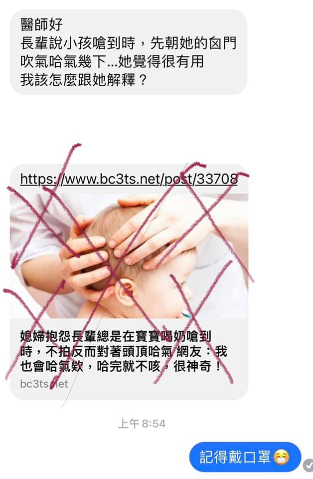 長輩說小孩嗆到時,先朝她的囟門吹氣哈氣幾下…