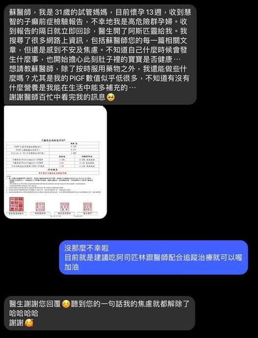 蘇醫師,我是31歲的試管媽媽,目前懷孕13週,收到慧智的子癲前症檢驗報告,不幸地我是高危險群孕婦。收到報告的隔日就立即回診,醫生開了阿斯匹靈給我。我搜尋了很多網路上資訊,包括蘇醫師您的每一篇相關文章,但還是感到不安及焦慮。不知道自己什麼時候會發生什麼事,也開始擔心此刻肚子裡的寶寶是否健康⋯