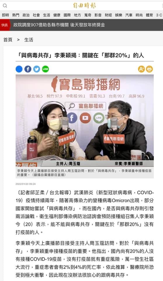 疫情持續兩年,隨著高傳染力的變種病毒Omicron出現,部分國家開始嘗試「與病毒共存」,而在國內,是否與病毒共存則引發兩派論戰,衛生福利部傳染病防治諮詢會預防接種組召集人李秉穎今(20)表示,能不能與病毒共存,關鍵在於「那群20%」沒有打疫苗的人。