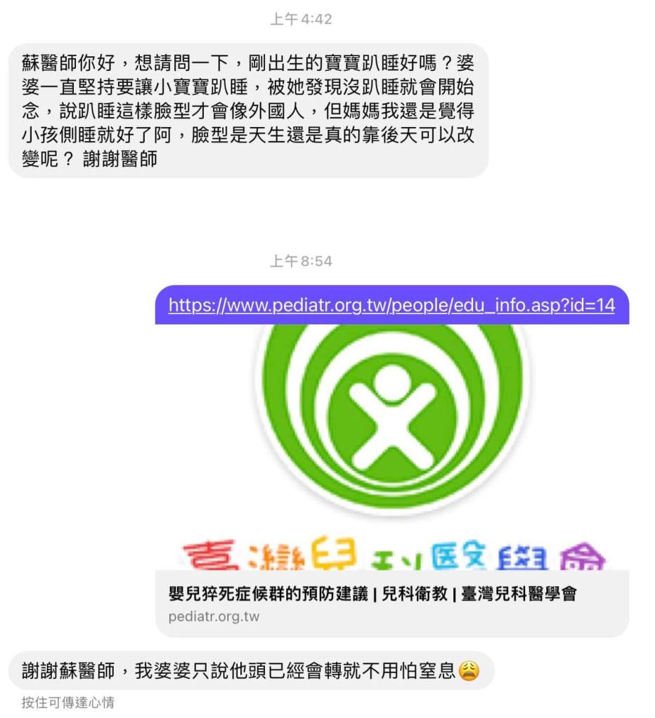 蘇醫師你好,想請問一下,剛出生的寶寶趴睡好嗎?婆婆一直堅持要讓小寶寶趴睡,被她發現沒趴睡就會開始念,說趴睡這樣臉型才會像外國人,但媽媽我還是覺得小孩側睡就好了阿,臉型是天生還是真的靠後天可以改變呢? 謝謝醫師