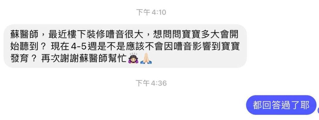 蘇醫師,最近樓下裝修躁音很大,想問問寶寶多大會開始聽到? 現在4-5週是不是應該不會因躁音影響到寶寶發育? 再次謝謝蘇醫師幫忙🙇🏻‍♀️🙏🏻