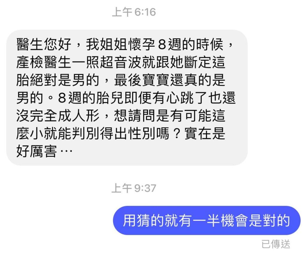醫生您好,我姐姐懷孕8週的時候,產檢醫生一照超音波就跟她斷定這胎絕對是男的,最後寶寶還真的是男的。8週的胎兒即便有心跳了也還沒完全成人形,想請問是有可能這麼小就能判別得出性別嗎?實在是好厲害⋯