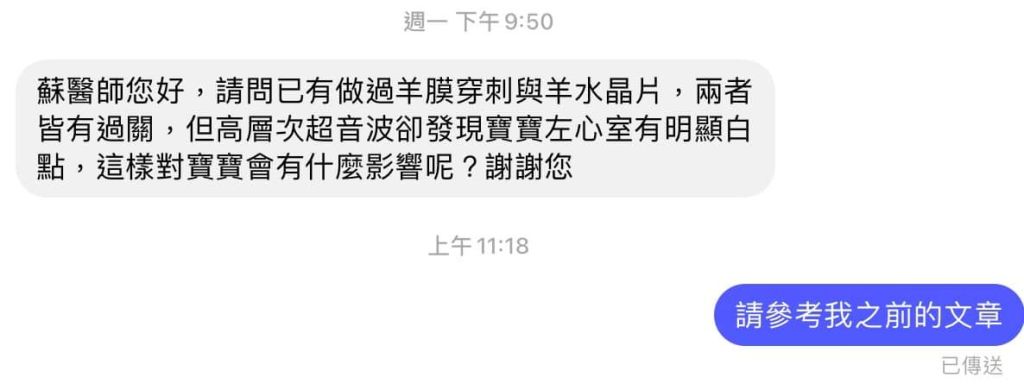 蘇醫師您好,請問已有做過羊膜穿刺與羊水晶片,兩者皆有過關,但高層次超音波卻發現寶寶左心室有明顯白點,這樣對寶寶會有什麼影響呢?謝謝您