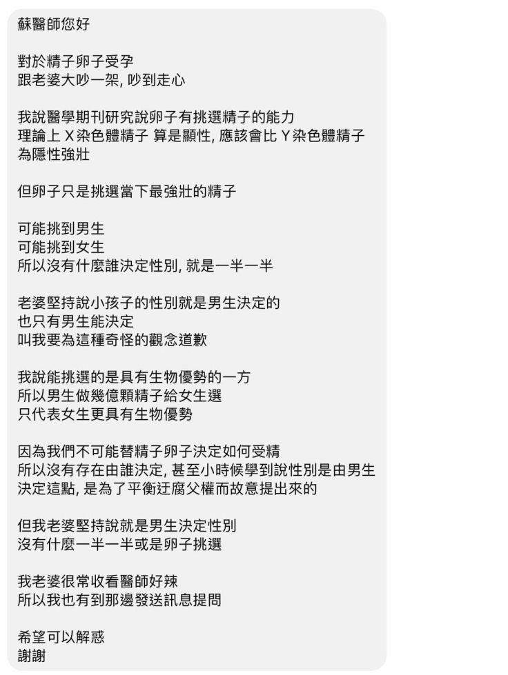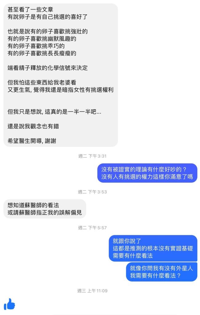 好認真的問題 好認真的問題只是不管是精子還是卵子決定反正都不是你們兩個人可以決定的 如果真的是精子決定的你可以控制你的精子嗎如果真的是卵子決定的你可以控制你的卵子嗎 既然不能控制那這到底有什麼好吵的? 我能開導你的就是為什麼要為了這種鳥事跟老婆吵架咧為什麼這麼不珍惜自己的生命呢你傻傻的我不懂。新同學我們有目錄請動個手指滑一下參考置頂文然後請善用搜尋功能謝謝FB原文討論串 分享此文: 分享到 X(在新視窗中開啟) X 分享到 Facebook(在新視窗中開啟) Facebook 喜歡 正在載入... 相關 發表留言 取消回覆 Δ