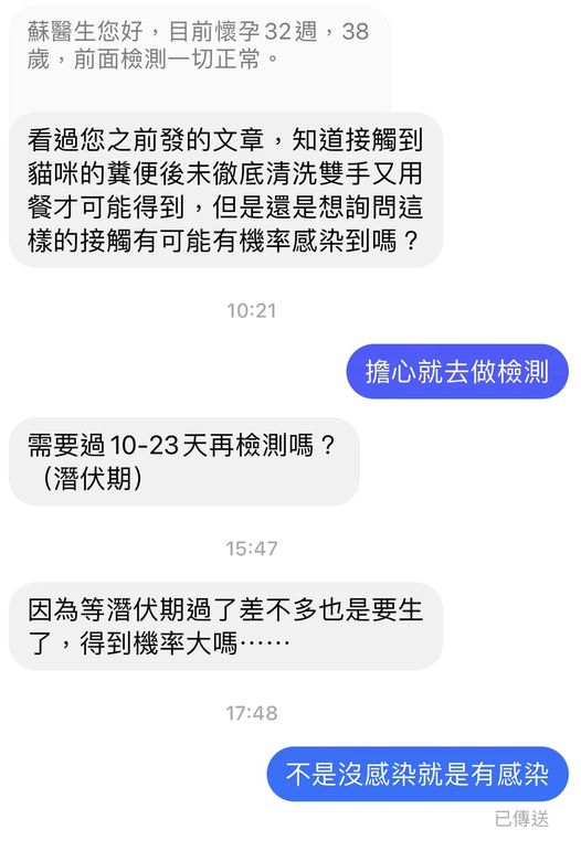 前情就是有位媽咪懷孕接觸到貓咪沒洗手怕感染就寫訊息來問我就醬