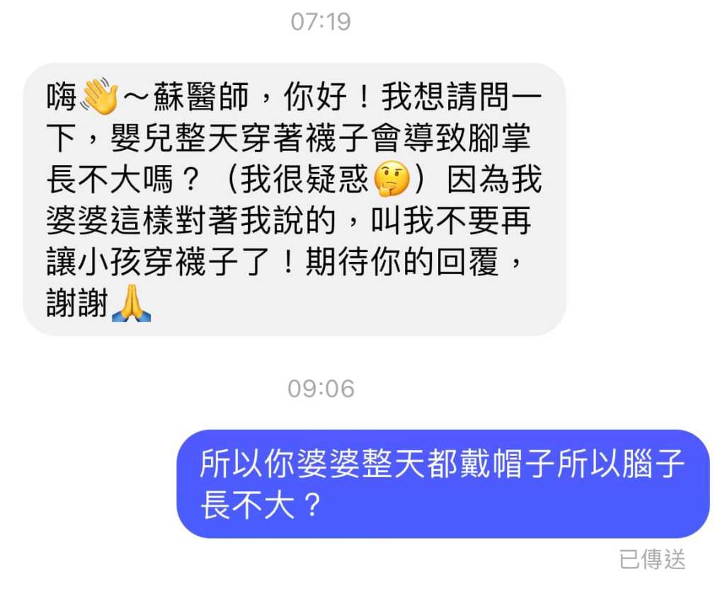 來函照登 來函照登 各位同學早安 穿襪子不是裹小腳好嗎 不會讓腳長不大 謝謝 =============== 新同學請先參考一下舊文章 很多 我知道 但跟你被洗腦已經一輩子時間的那些迷思比起來 你只需花比你人生短很多很多的時間就可以看完 我們有目錄請動動手指頭滑一下參考置頂文 然後 請善用搜尋功能 所有文章我都也有放在部落格 請google搜尋⋯⋯ 蘇怡寧醫師愛碎念 或是 蘇醫師愛碎念 或者 好像打蘇醫師就會跑出來 你試試 然後 請善用裡面的搜尋功能 以上 FB原文討論串 分享此文: 按一下即可分享至 X(在新視窗中開啟) X 按一下以分享至 Facebook(在新視窗中開啟) Facebook 喜歡 正在載入... 相關 發表留言 取消回覆 Δ