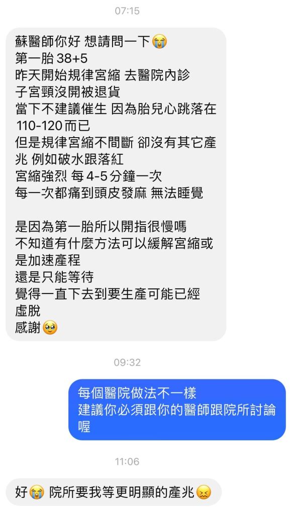 我們會根據媽咪當時的狀況跟媽咪作說明擬定各種策略然後讓媽咪們自己做決定是否要住院待產還是要先打減痛還是再回去等待