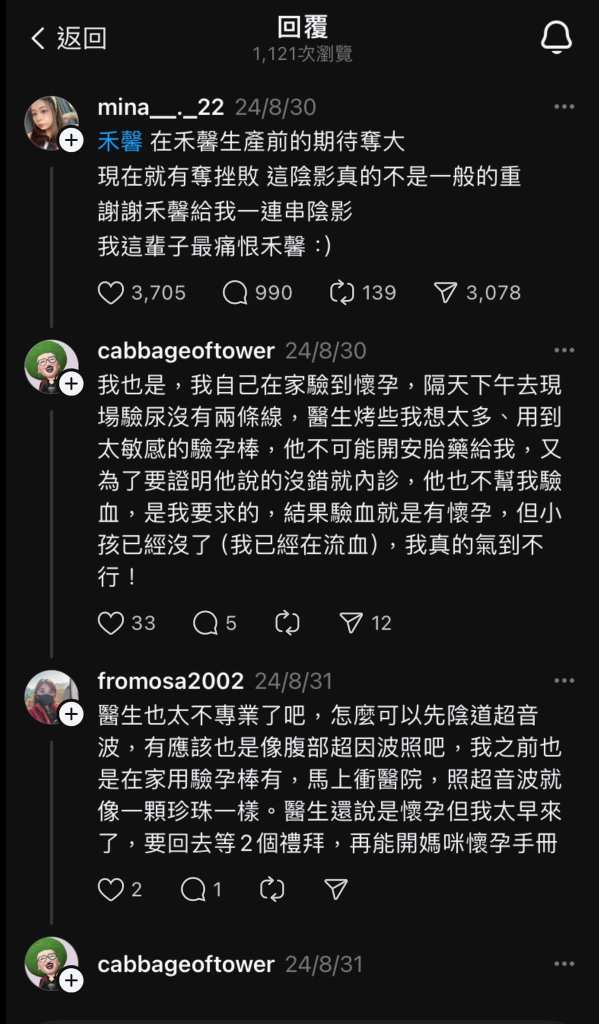 我也是,我自己在家驗到懷孕,隔天下午去現場驗尿沒有兩條線,醫生烤些我想太多、用到太敏感的驗孕棒,他不可能開安胎藥給我,又為了要證明他說的沒錯就內診(後面有補充是陰道超音波),他也不幫我驗血,是我要求的,結果驗血就是有懷孕,但小孩已經沒了(我已經在流血),我真的氣到不行!