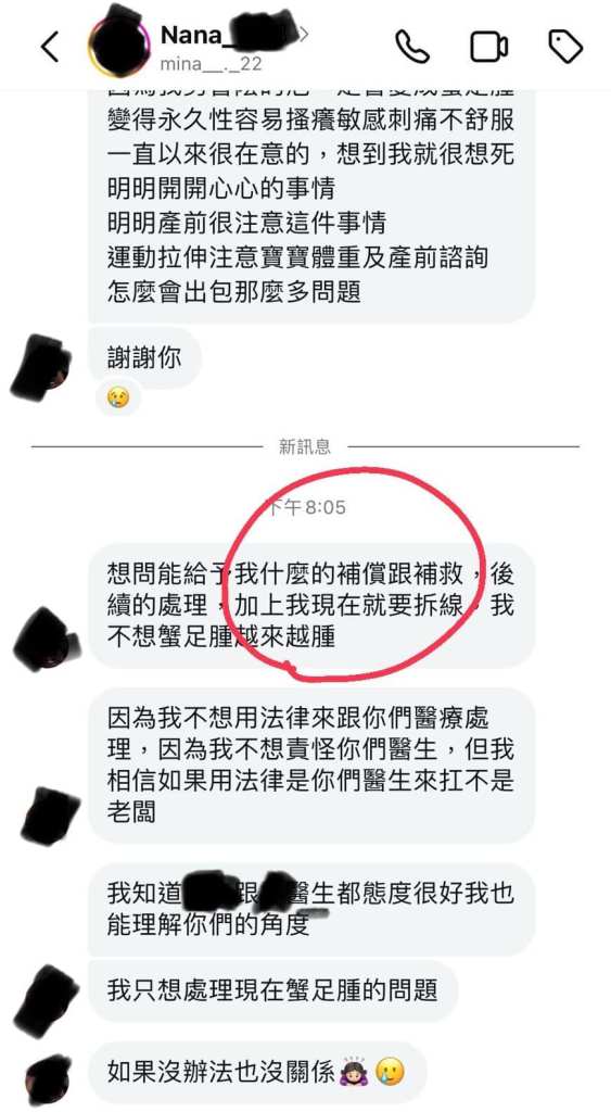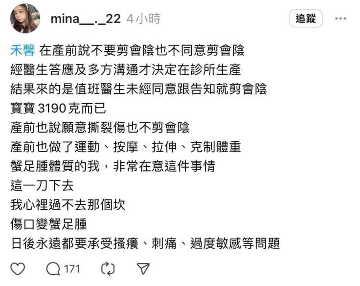 「醫師在門診答應我可以不剪會陰,結果接生的醫師還是剪了導致我的傷口產生蟹足腫」