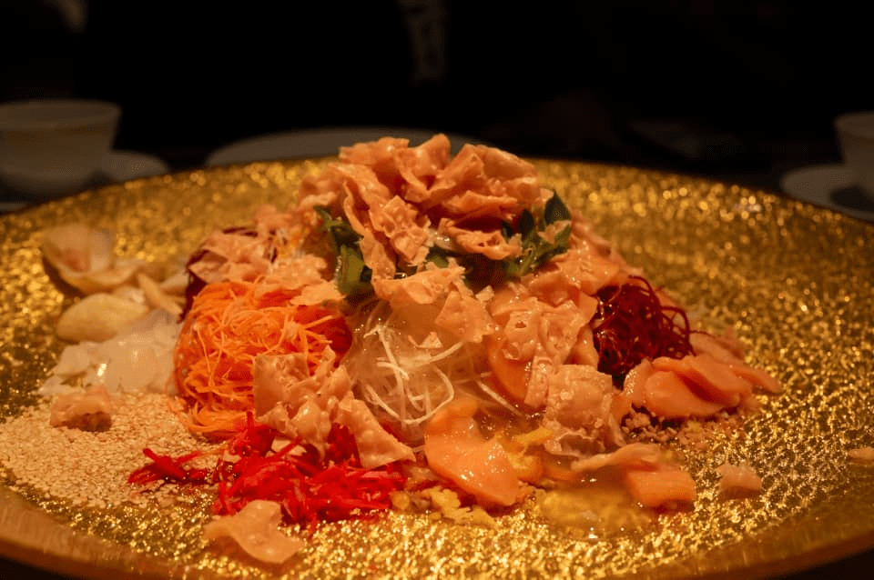 主要材料包括生魚片(通常是鮭魚)、切絲的紅蘿蔔、白蘿蔔、青瓜、炸餛飩皮、花生碎、芝麻等,並淋上甜酸的梅醬或李子醬
