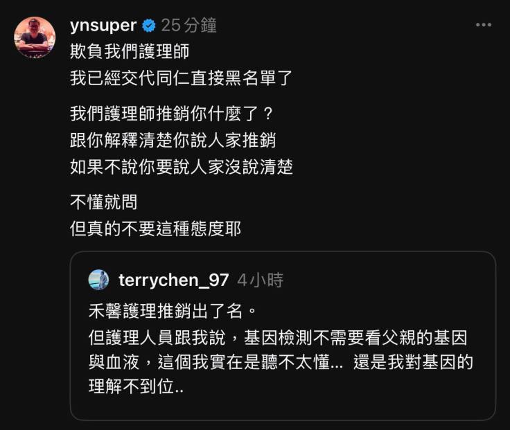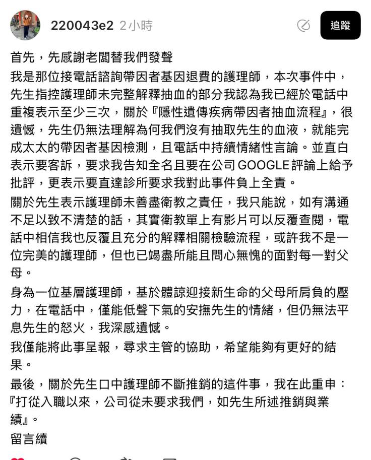 尋人啟事24的後續 尋人啟事24的後續 剛剛我們同仁傳這個訊息給我 我真的很難過 你把我們一個善良的護理師搞到要去看身心科 我很火 這位在半導體業的陳先生 不要以為你刪文然後換個帳號繼續胡說八道 我就會放過你 你等我 FB原文討論串 分享此文: 按一下即可分享至 X(在新視窗中開啟) X 按一下以分享至 Facebook(在新視窗中開啟) Facebook 喜歡 正在載入... 相關 發表留言 取消回覆 Δ