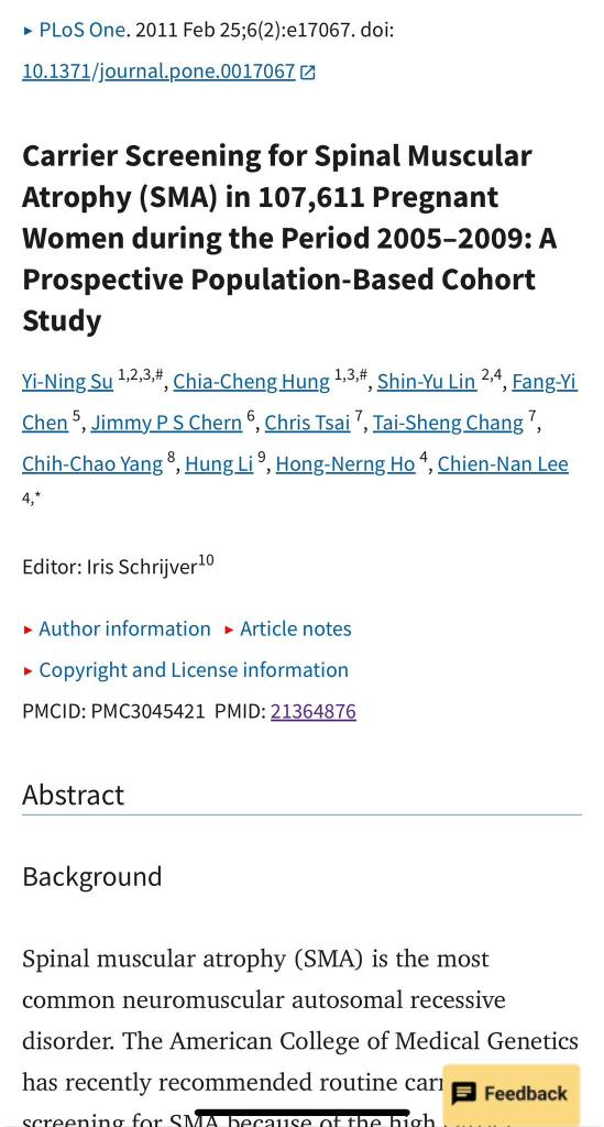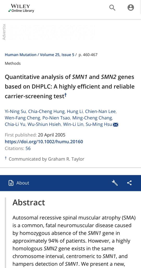 我把我們關於脊髓性肌肉萎縮症帶因檢測的論文放在照片處