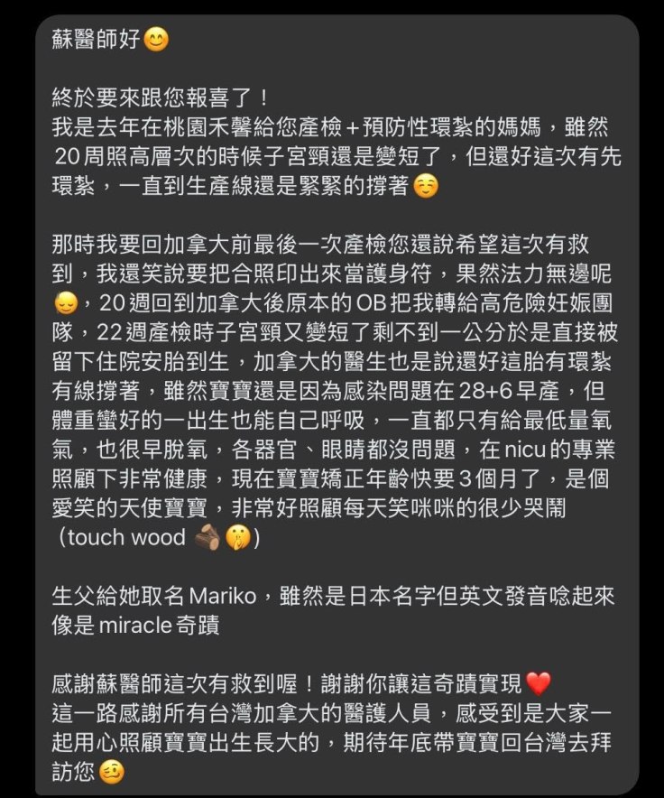 那時我要回加拿大前最後一次產檢您還說希望這次有救到,我還笑說要把合照印出來當護身符,果然法力無邊呢🙂↕️,20週回到加拿大後原本的OB把我轉給高危險妊娠團隊,22週產檢時子宮頸又變短了剩不到一公分於是直接被留下住院安胎到生,加拿大的醫生也是說還好這胎有環紮有線撐著,雖然寶寶還是因為感染問題在28+6早產,但體重蠻好的一出生也能自己呼吸,一直都只有給最低量氧氣,也很早脫氧,各器官、眼睛都沒問題,在nicu的專業照顧下非常健康,現在寶寶矯正年齡快要3個月了,是個愛笑的天使寶寶,非常好照顧每天笑咪咪的很少哭鬧(touch wood 🪵🤫)