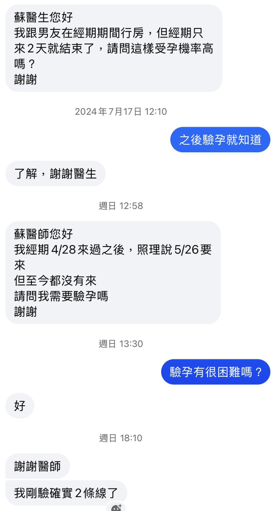 問就是驗孕 問就是驗孕 各位同學早安 再說一次 婦產科 只要是關於月經不規則的問題 只要有性經驗還沒停經 一律先驗孕。 問一年了還是一樣答案 歸剛欸 然後 在現在的世道 驗到兩條線 我會忍住不會先說恭喜 不然下一句你回我但是我不想要我也是很尷尬 就醬 FB原文討論串 分享此文: 按一下即可分享至 X(在新視窗中開啟) X 按一下以分享至 Facebook(在新視窗中開啟) Facebook 喜歡 正在載入... 相關 在〈問就是驗孕〉中有 1 則留言 Add yours 引用通告: 蘇醫師愛碎念導覽目錄(置頂文) – 蘇怡寧醫師愛碎念 發表留言 取消回覆 Δ