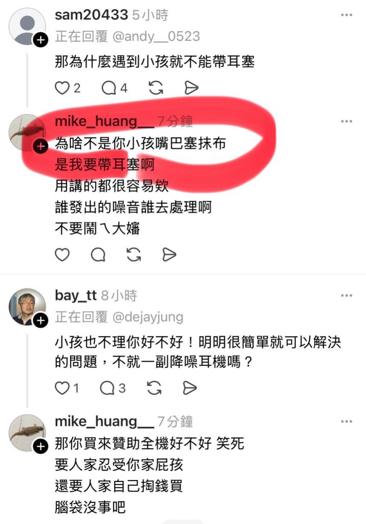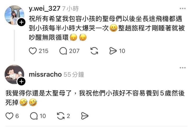 小孩吵就不要出門不喜歡就不要生是你自己要生的沒人叫你生不會教就不要生無孩區才是文明象徵等等語句