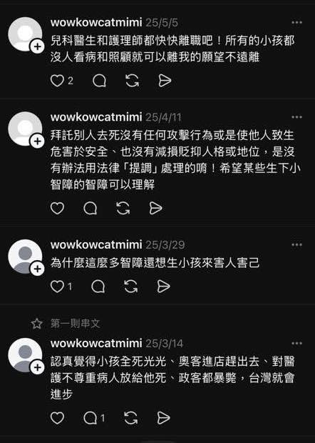 包括什麼叫嬰兒都去死一死不然出來全部都應該貼膠帶為什麼不關在家裡不會教不要生等等的可怕言論