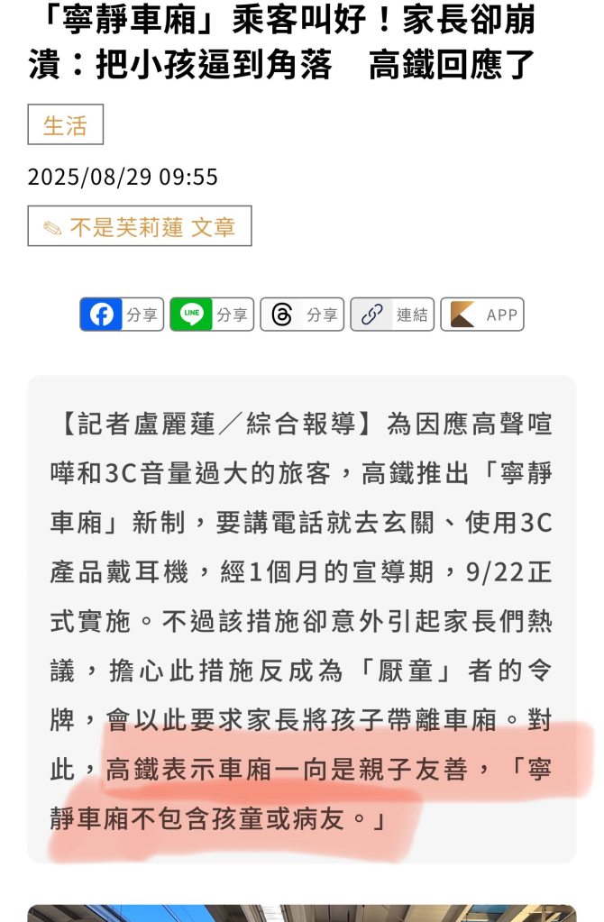 高鐵不厭童喔 高鐵不厭童喔 厭童仔們 很抱歉讓你們失望了 最新的高鐵寧靜車廂規則跟你們的厭童沒關係喔 高鐵表示 《我們車廂是親子友善的,寧靜車廂不包含孩童或病友》 好了 厭童仔們你們繼續去崩潰吧 掰掰👋 FB原文討論串 分享此文: 分享到 X(在新視窗中開啟) X 分享到 Facebook(在新視窗中開啟) Facebook 喜歡 正在載入... 相關 發表留言 取消回覆 Δ