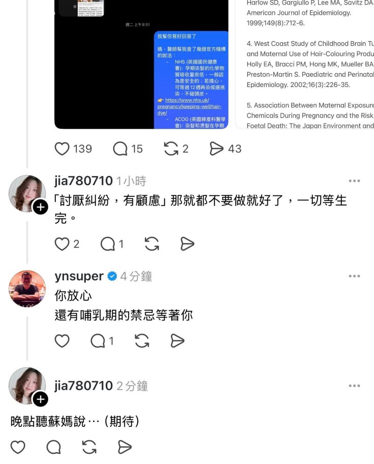 目前沒有高品質研究證明哺乳期染髮或燙髮會對寶寶造成臨床上明顯危害