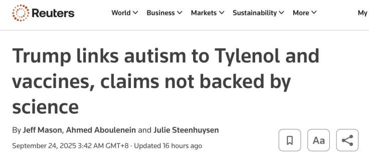 Reuters則提醒目前的研究並未證實Tylenol與自閉症有因果關係