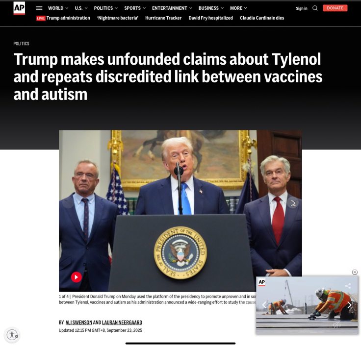 美聯社報導直接指出川普重複了早已被推翻的疫苗與自閉症連結而且沒有任何新證據支持