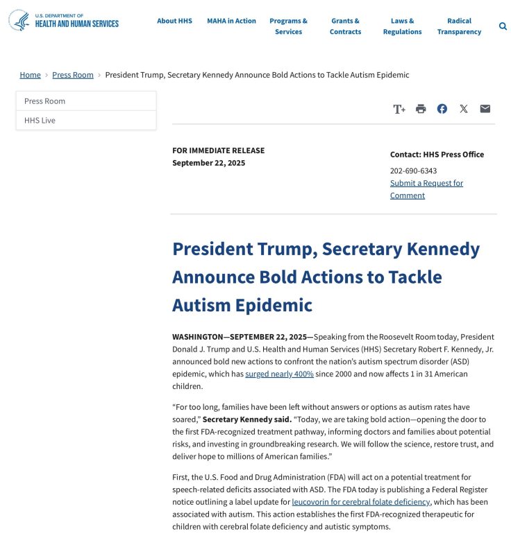自閉症科學基金會批評白宮發言缺乏科學根據會誤導大眾