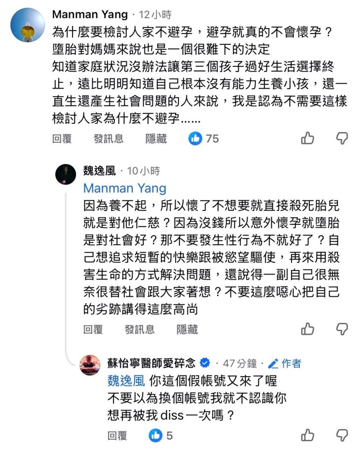 為什麼網路蟑螂需要這麼多假帳號? 為什麼網路蟑螂需要這麼多假帳號? 昨天跟大家聊到流產的方式 在下面留言就有人說什麼為什麼不避孕的啪啦啪啦我真心覺得很有事 這種說法就跟那些厭童仔一樣 說什麼不會教不要生或是沒把握不會吵那就不要帶出來 一樣87 你知道沒有避孕方式是百分之百有效的嗎? 這些人就是只會靠一張嘴 怎樣啦人家是擋到你祖墳喔 無聊 還有還有 這個魏逸風有超過87趴的機會跟前兩天那個秒刪帳號的俗阿是同一個傢伙 你繼續啊 我笑著等你 就醬 FB原文討論串 Screenshot 分享此文: 分享到 X(在新視窗中開啟) X 分享到 Facebook(在新視窗中開啟) Facebook 喜歡 正在載入... 相關 發表留言 取消回覆 Δ