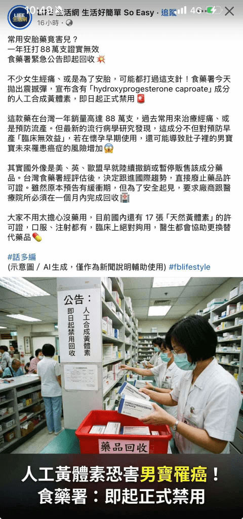4 衛生福利部食品藥物管理署. 公告含 hydroxyprogesterone caproate 成分藥品許可證廢止及藥品回收事宜. 2026.