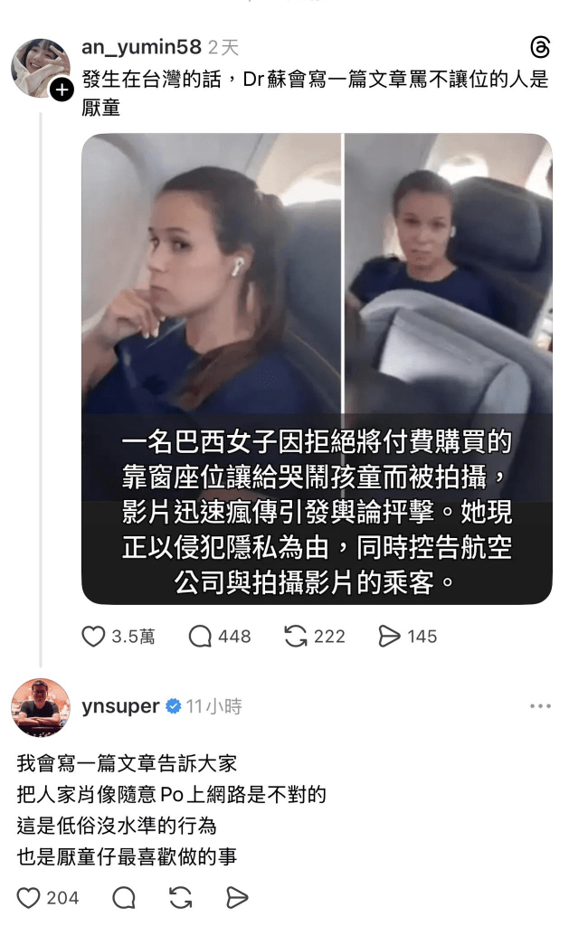 當時小孩的家長和旁邊的乘客指責她沒有同理心 錄影者甚至在影片中出言嘲諷