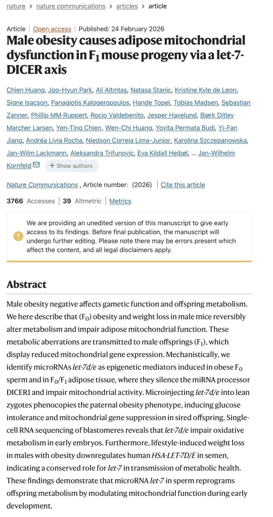 1. Huang C, Park JH, Altıntaş A, et al. Male obesity causes adipose mitochondrial dysfunction in F1 mouse progeny via a let-7-DICER axis. Nat Commun. Published online February 24, 2026. doi:10.1038/s41467-026-69686-5