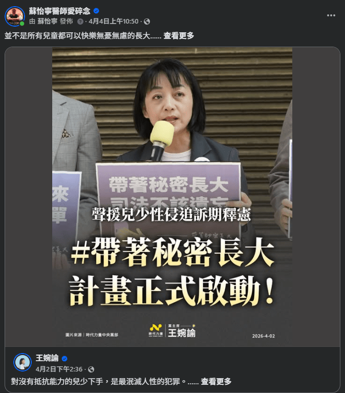 並不是所有兒童都可以快樂無憂無慮的長大 並不是所有兒童都可以快樂無憂無慮的長大 2024年 台灣一年有4793個孩子遭受到性侵害 很多事情 是不應該分黨派的 兒童性侵害的議題就是如此 我很感謝婉諭在這個領域的努力 我也衷心希望 我們可以給孩子一個更安全的未來 一起努力一下吧❤️ #帶著秘密長大 原文討論串 分享此文: 分享到 X(在新視窗中開啟) X 分享到 Facebook(在新視窗中開啟) Facebook 喜歡 正在載入... 相關 發表留言 取消回覆 Δ