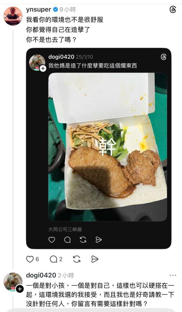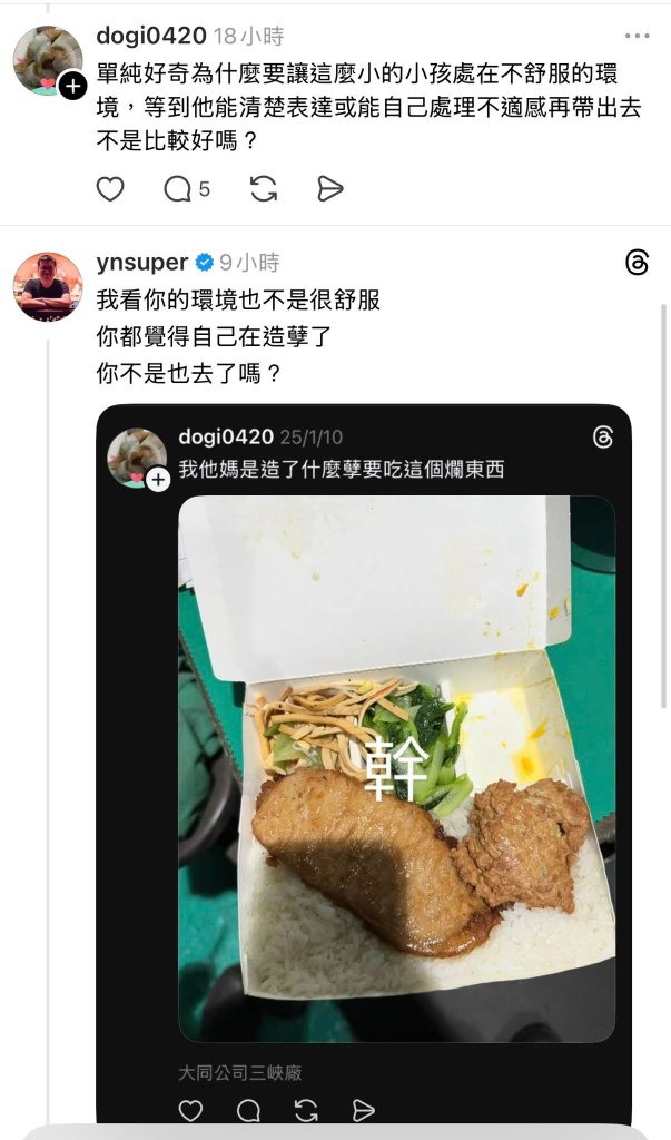 一個是對小孩,一個是對自己,這樣也可以硬搭在一起,這環境我選的我接受,而且我也是好奇請教一下沒針對任何人,你留言有需要這樣針對嗎?