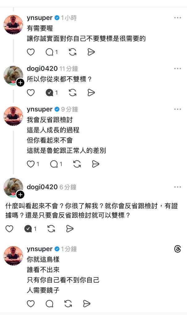什麼叫看起來不會?你很了解我?就你會反省跟檢討,有證據嗎?還是只要會反省跟檢討就可以雙標?