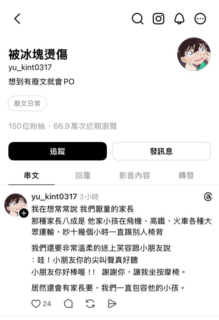 厭童仔永遠不會思考 厭童仔永遠不會思考 自己也是被包容長大的 你被社會包容長大 然後讓你長大再來厭我們的下一代 自私。 荒謬。 原文討論串 ScreenshotScreenshot 分享此文: 分享到 X(在新視窗中開啟) X 分享到 Facebook(在新視窗中開啟) Facebook 喜歡 正在載入... 相關 發表留言 取消回覆 Δ