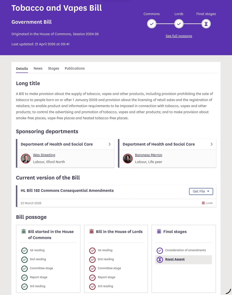 1 UK Parliament — Tobacco and Vapes Bill(2026)